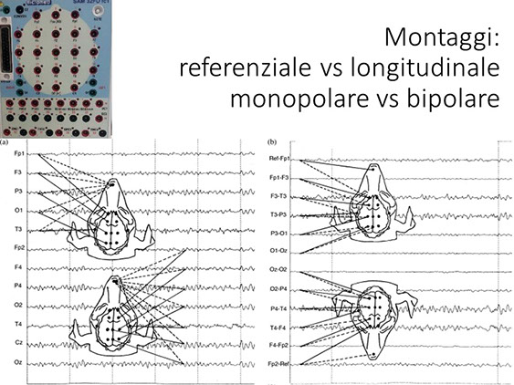 L’EEG è la rappresentazione grafica della differenza di potenziale elettrico registrata tra un elettrodo “attivo” (esplorante), posto in prossimità della sede dove si svolge l’attività neuronale, e un elettrodo di riferimento collocato a una certa distanza dal primo. In alcune configurazioni bipolari gli elettrodi possono essere entrambi attivi, o influenzati dall’attività elettrica cerebrale, mentre nelle derivazioni monopolari solo un elettrodo è esplorante mentre quello di riferimento non ne è influenzato.