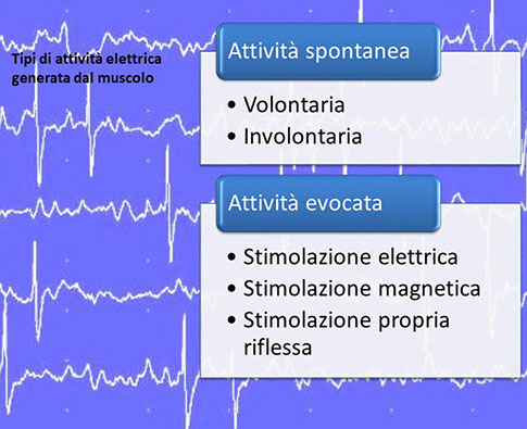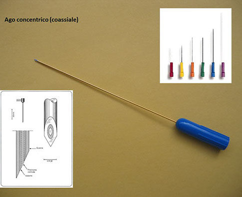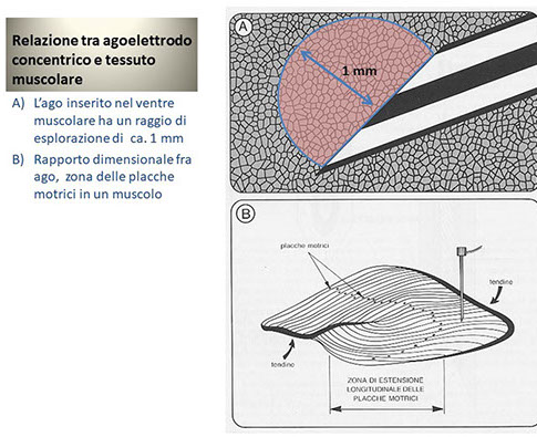 L’esame EMG si esegue inserendo nel ventre muscolare un ago-elettrodo di diametro e lunghezza variabili a seconda delle dimensioni del muscolo studiato. Questi aghi possono essere di tipi diversi (bipolari, monopolari, a singola fibra), ma il più comunemente impiegato nella pratica clinica è quello bipolare concentrico, in cui un filamento metallico centrale di ca. 0,1-0,15 mm di diametro è circondato da una guaina metallica di ca 0,5 mm. Un isolante separa le due componenti ed è possibile in tal modo registrare la differenza di potenziale che si crea sulla sommità dell’ago fra il filamento e la guaina come conseguenza dell’attività elettrica muscolare.