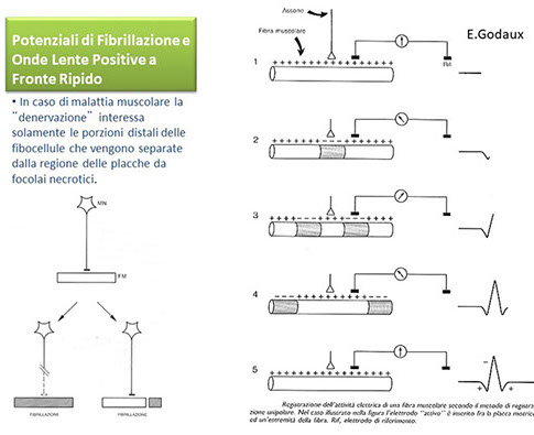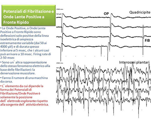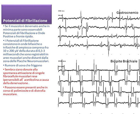 Se il muscolo è denervato anche in minima parte sono osservabili Potenziali di Fibrillazione e Onde Positive a fronte ripido. I primi consistono in onde bifasiche o trifasiche di ampiezza compresa fra 10 e 200 µV della durata di 0,3-3 millisecondi che sono registrabili in aree muscolari anche distanti dalla zona delle Placche Neuromuscolari. Il suono che fanno agli altoparlanti è caratteristico e assomiglia molto a quello prodotto dalle uova che friggono in un tegame. Sono dovute alla spontanea attivazione di singole fibrocellule muscolari rese ipersensibili all’acetilcolina dalla denervazione e possono essere presenti anche in corso di polimiosite e di distrofia muscolare. In questi ultimi due casi la “denervazione” interessa solamente le porzioni distali delle fibocellule che vengono separate dalla regione delle placche da focolai necrotici.