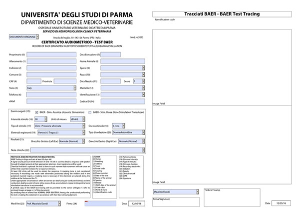 Attualmente il Servizio Diagnostico di Neurofisiologia Clinica interno all'Ospedale Veterinario Universitario Didattico di PARMA (OVUD) è accreditato ENCI per la diagnosi della SORDITA' CONGENITA DEL CANE e svolge un servizio di screening per gli allevatori provenienti da diverse regioni d'Italia.